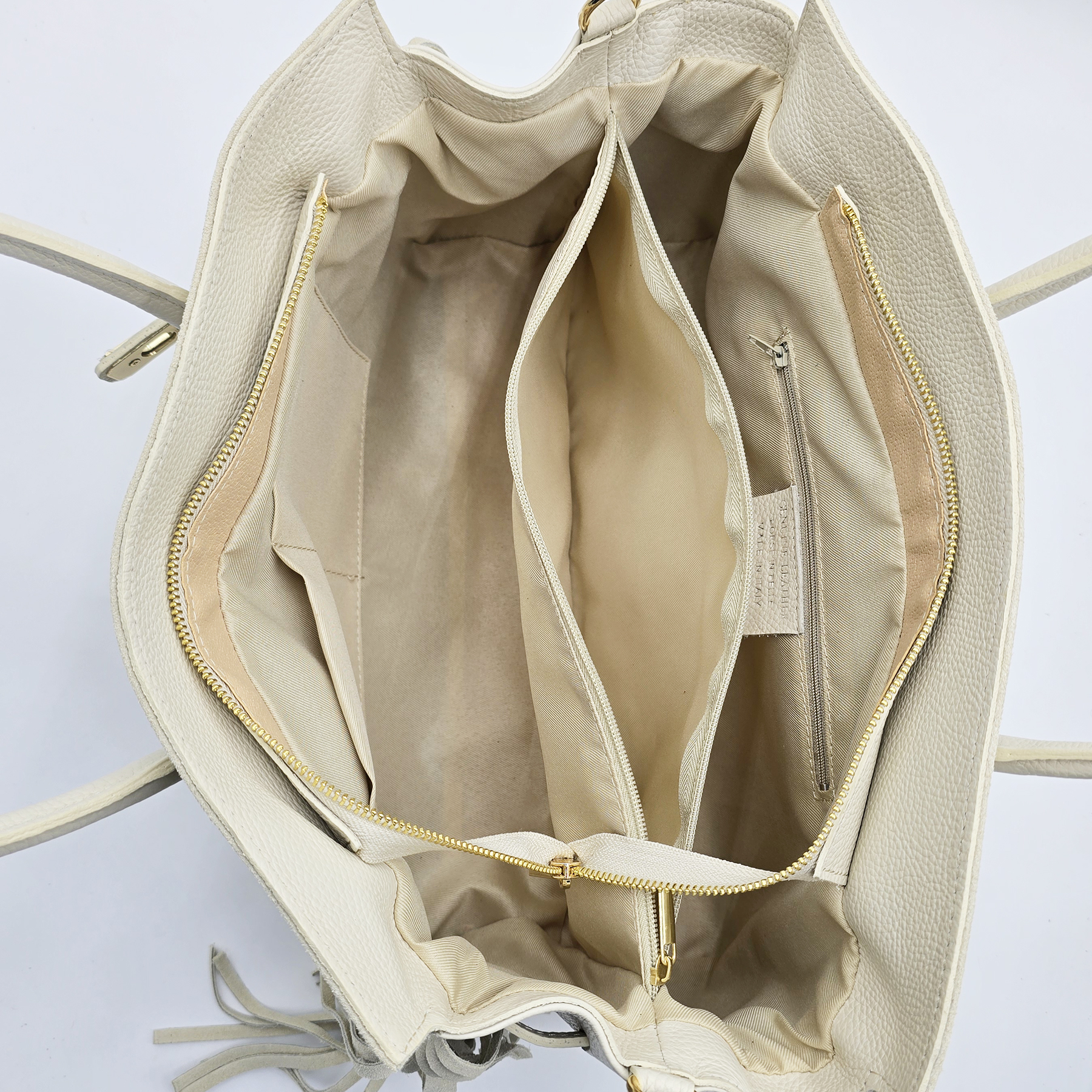 L’interno, ampio e curato, presenta una fodera in tessuto con tasche portaoggetti e scomparti con zip, permettendoti di trovare tutto in un istante. Con la sua base rinforzata e i piedini in metallo, la Portofino non è solo una borsa, ma un investimento di stile destinato a durare nel tempo.